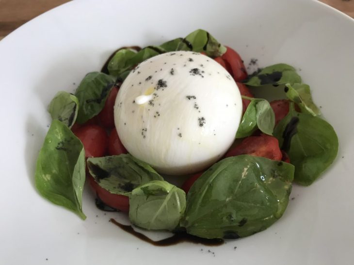 Ein Tomatensalat mit Burrata, frischen Basilikumblättern und nativem Olivenöl schmeckt an lauen Sommerabenden einfach erfrischend. Ursprünglich stammt die Frischkäsespezialität aus Kuhmilch aus Apulien und ähnelt einer Mozzarella. Doch im Unterschied zur Mozzarella ist die innere Konsistenz der Burrata cremig, fast sogar flüssig. Wer den traditionellen Caprese-Salat mag, der wird die Burrata-Variante lieben!