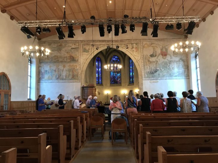 Da der Workshop nicht an unserem gewöhnlichen Probenort in Uster stattfand, sondern diesmal in Pfäffikon (ZH) stellt sich zuvor bei allen Beteiligten immer die Frage, wie man dorthin kommt. Statt mit dem Auto zur Probe zu fahren oder die öffentlichen Verkehrsmittel zu benutzen, habe ich mich mit einer weiteren Sängerin für das Velo entschieden. Von meinem zu Hause sind das knapp 10 km Strecke mit 134 Höhenmetern. Bei den warmen Temperaturen (30 Grad) kein Zuckerschlecken. Vor allem der Berg in Wermatswil hatte es in sich – dort ging es eine gefühlte Ewigkeit nur bergauf – tatsächlich sind es rund 3 km. Oben angekommen, habe ich es mir nicht nehmen lassen, die Aussicht zu geniessen und mal richtig durchzuschnaufen, bevor es dann bergab zur reformierten Kirchengemeinde in Pfäffikon ging. Nachdem wir uns frisch gemacht und umgezogen haben, waren wir startklar für die Paukenmesse von Joseph Haydn und die 9. Symphonie von Ludwig van Beethoven.
