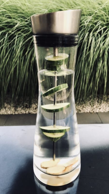 Dieser Sommer ist heiss. Heute hat das Thermometer 33 Grad angezeigt. Auch Nachts kühlt es nicht richtig ab – die Temperaturen fallen seit Tagen nicht unter die 20-Grad-Marke. Umso wichtiger ist es, genügend zu trinken. Mit wenigen Zutaten könnt ihr Wasser aufpeppen. Einige dünne Scheiben einer Biogurke an den Karaffeneckel aufspiessen. Karaffe mit Wasser befüllen. Ingwerscheiben und einige Spritzer Zitronensaft nach Belieben hinzufügen. Gurken-Ingwer-Wasser kalt stellen und rund 30 Minuten ziehen lassen. Fertig. Prost!
