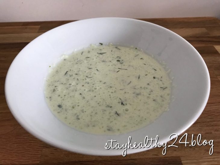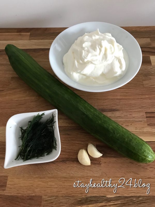 Für vier Personen habe ich zwei Knoblauchzehen und eine Biogurke püriert, 500 Gramm griechischen Yoghurt untergehoben, 2 Esslöffel zerkleinerten Dill und 20 Milliliter Olivenöl hinzugefügt. Zum Schluss die Gurkensuppe mit Salz und Pfeffer abschmecken und etwa zwei Stunden kaltstellen. Wer es dünnflüssiger mag, der kann noch 200 Milliliter Wasser hinzufügen.