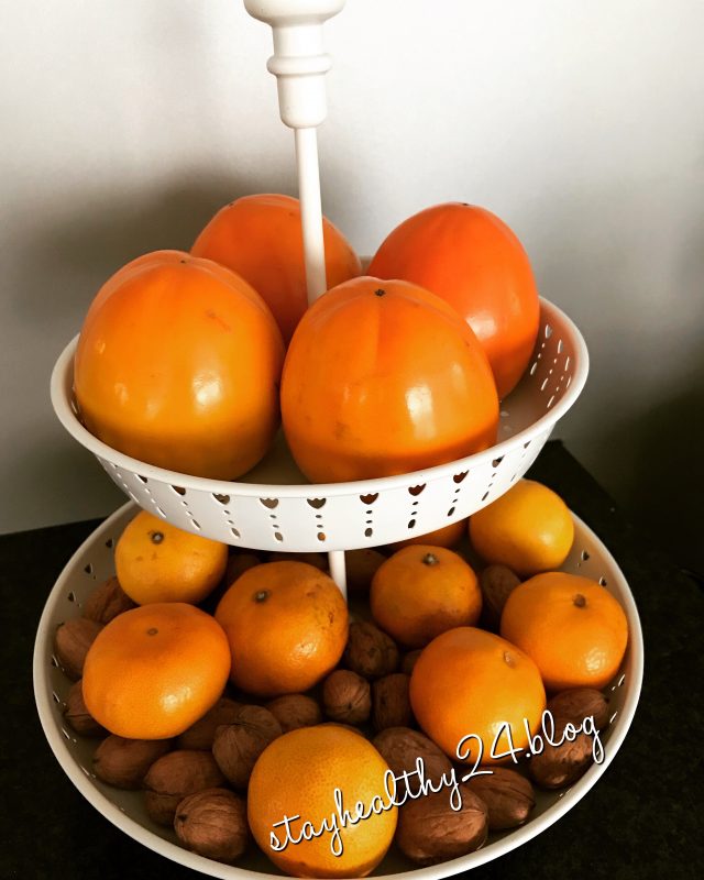 Kennt ihr das auch? Am Nachmittag gegen 16 Uhr macht sich ein „Hüngerchen“ auf Süsses bemerkbar. Da ich Appetit nicht mit Süssigkeiten stillen möchte, suche ich nach gesunden Alternativen. Kaki, Clementinen und Walnüsse versüssen mir den Nachmittag. Im Winter sind Kakis meine absoluten Favoriten unter den Früchten. Clementinen sind erfrischend und reich an Vitamin C. Walnüsse sind zwar kalorienreich, dafür enthalten sie wertvolle ungesättigte Fettsäuren. Die winterlichen Snacks sind fein und verleihen mir die nötige Energie bis zum Abendessen.