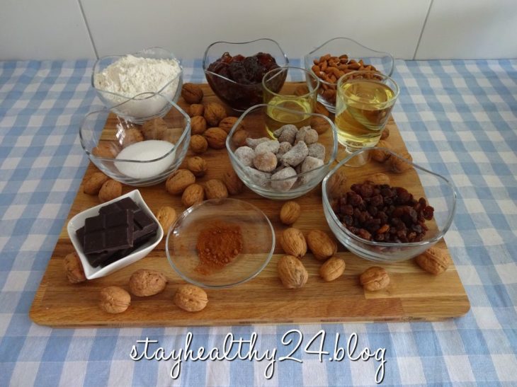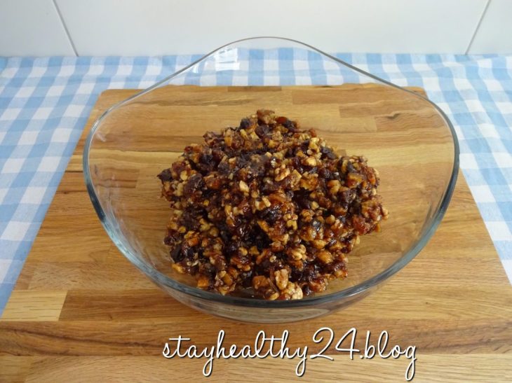 In der Zwischenzeit für die Füllung Rosinen in etwas Wasser aufweichen. Mandeln 10 Minuten bei 200 Grad im Backofen rösten. Baumnüsse knacken und mit den abgekühlten Mandeln hacken. Feigen in Würfel schneiden. Zartbitterschokolade zerkleinern. In eine Schüssel die Pflaumenmarmelade füllen und die Mandeln, Baumnüsse, Rosinen, Feigen und die Schokolade hinzugeben und alles gut verrühren.