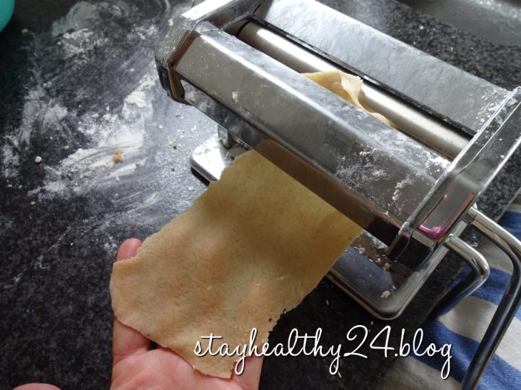 Den Teig in kleinen Portionen durchkneten und eine Portion Teig durch die Walze der Pastamaschine drehen und dabei mit der grössten Stufe beginnen. Den Teig bei Bedarf mit etwas Mehl bestäuben. Diesen Vorgang mehrmals wiederholen, bis der Teig schön glatt ist und dabei die Walzen jedes Mal eine Stufe enger stellen.